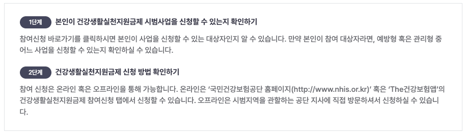 건강생활실천지원금제 시범사업은 국민들이 자신의 건강 상태를 스스로 파악할 수 있도록 정보를 제공하고, 개인이 건강한 생활 습관을 적극적으로 실천하며 건강 상태의 개선에 따라 포인트를 받을 수 있는 프로그램입니다. 아래 참고해보시고 신청해보세요.