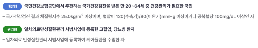 두 번째 유형은 관리형으로, 고혈압이나 당뇨병과 같은 만성질환을 가진 사람들이 대상입니다. 이들은 일차의료 만성질환관리 시범사업에 등록하고 개인별 케어플랜을 수립한 사람들입니다.