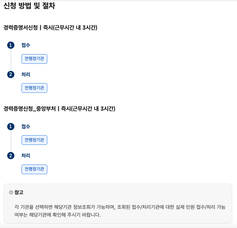 - 처리: 요청이 접수되면, 기관의 내부 절차에 따라 경력증명서가 발급됩니다.