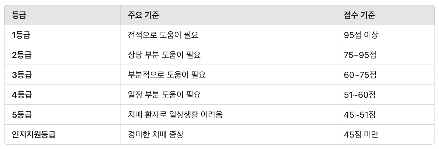 - 조사 항목: 신체기능, 인지기능, 행동 변화 등 총 52개 항목에 대해 점수를 매깁니다.
