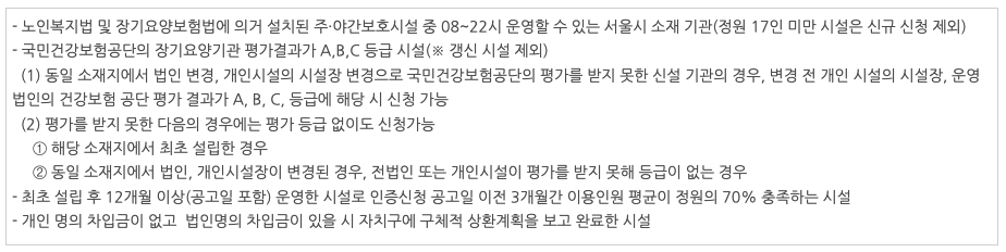 1. 운영 시간: 08시부터 22시까지 운영할 수 있는 서울시 소재 기관이어야 하며, 정원 17인 미만 시설은 신규 신청이 불가능합니다.
