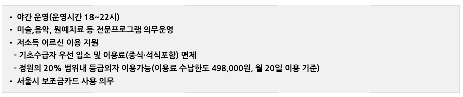 - 저소득 어르신 지원: 기초수급자를 우선으로 입소시키며, 이용료(중식·석식 포함)를 면제합니다. 정원의 20% 범위 내에서 등급 외자도 이용할 수 있습니다.