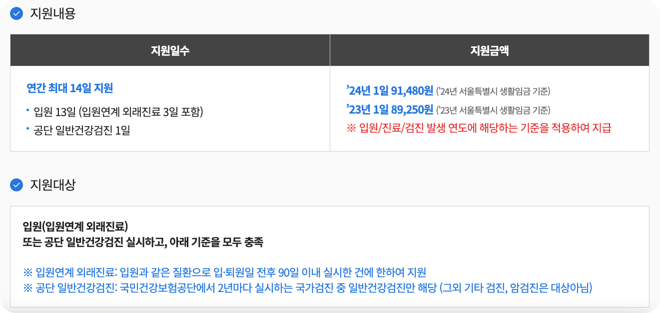 건강보험공단의 일반건강검진도 지원 대상에 포함되어 있어서, 건강을 챙기면서도 생계 부담을 줄일 수 있다는 점이 큰 장점이에요.