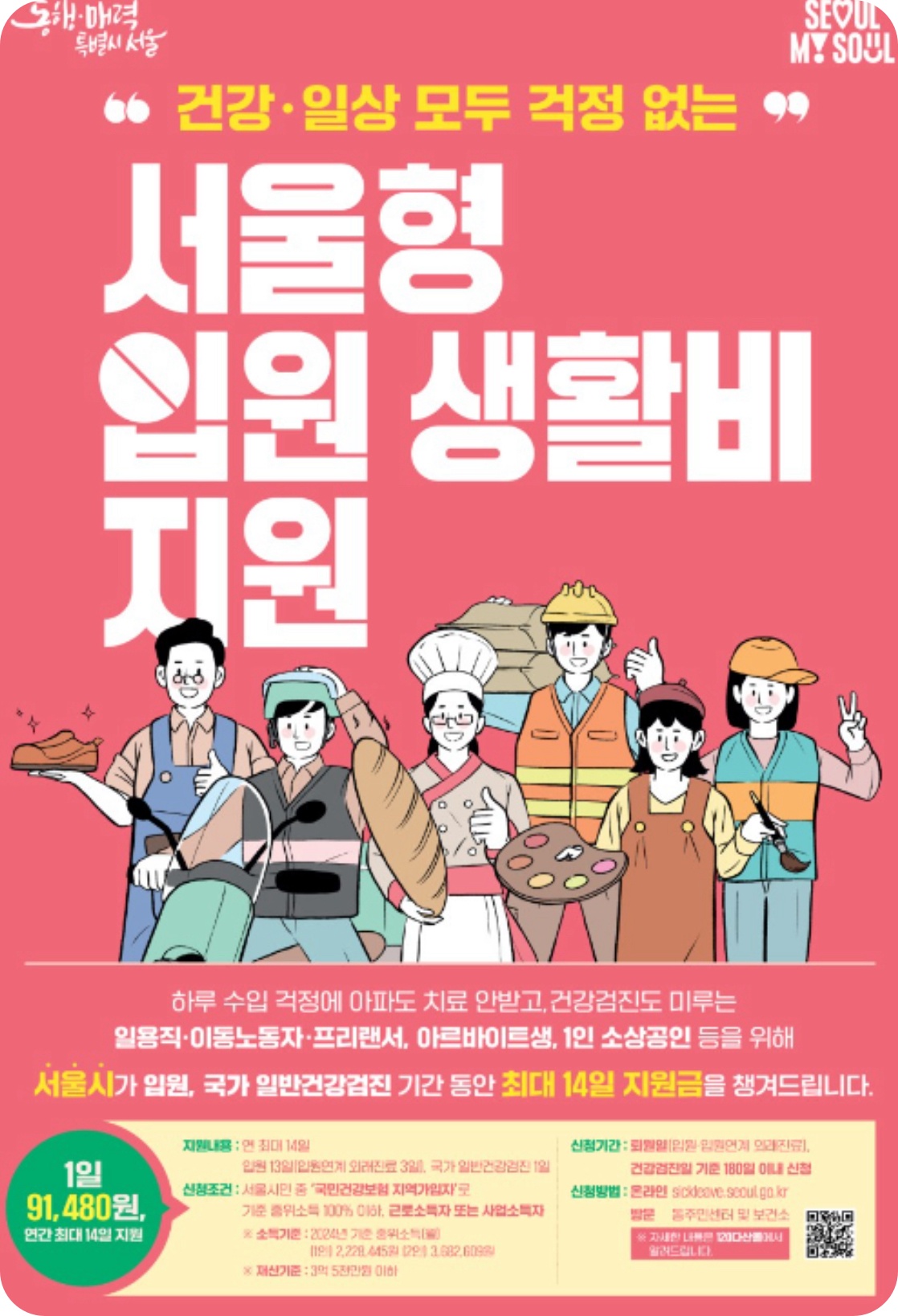 서울형 입원생활비 지원사업은 서울시민이라면 누구나 대상이 될 수 있고, 간단한 신청 절차로 부담 없이 지원받을 수 있으니, 본인이 대상에 해당하는지 꼭 확인해보시고 신청해 보세요.