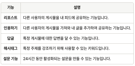 스레드의 홈 화면은 인스타그램의 UI와 유사하지만, 내가 팔로우하지 않은 사람들의 글도 보여줍니다. 이는 엑스(X)와 유사한 점으로, 사용자들은 다양한 게시물을 탐색하고 소통할 수 있습니다. 각 게시물에는 좋아요, 댓글, 리포스트 기능이 있어 상호작용이 가능합니다.