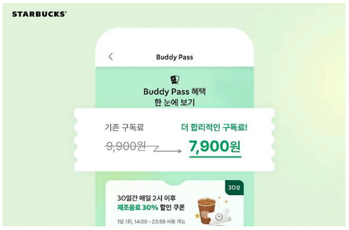 버디 패스는 스타벅스 최초의 구독 서비스인데, 매일 오후 2시 이후부터 이용할 수 있는 고객층에게 다양한 혜택을 제공하는게