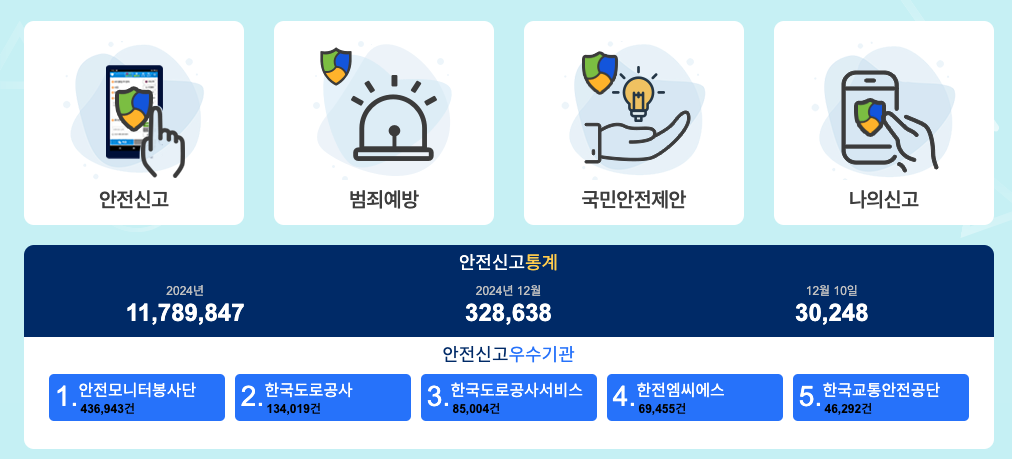 안전신문고는 생활 주변의 안전 위험요소를 신고할 수 있는 시스템입니다.