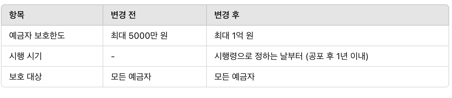 - 현행 보호한도: 최대 5000만 원 (원금 + 이자 포함)