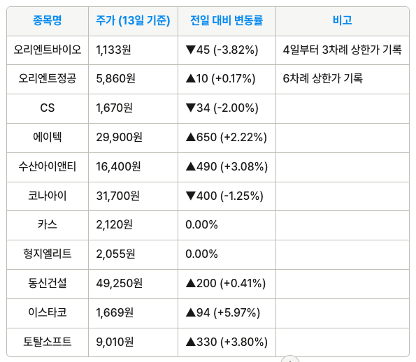 이 대표 관련주인 오리엔트바이오는 13일 기준으로 전일 대비 24% 이상 상승하며, 4일부터 이날까지 세 차례 상한가를 기록했습니다. 오리엔트정공은 6차례 상한가를 찍으며 주가가 6배 가까이 상승했습니다.