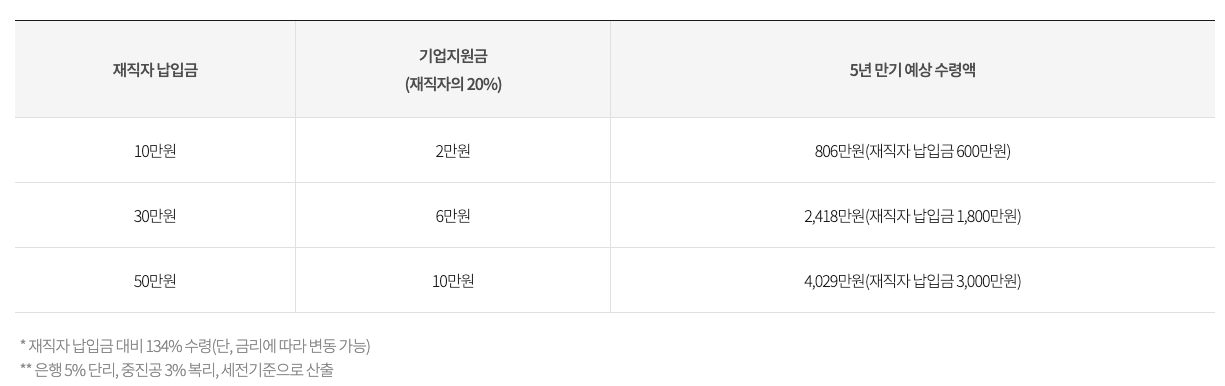 근로자가 월 50만 원씩 5년 동안 저축하면 기업이 매달 10만 원을 추가 적립합니다. 여기에 우대 금리를 포함하면 5년 뒤 만기 시 약 4,027만 원을 수령할 수 있습니다.