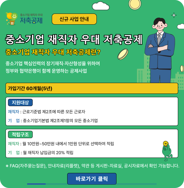 - 혜택: 근로자가 납입한 금액의 20%를 기업이 추가 지원하며, 은행에서 최대 5%의 우대 금리를 제공합니다.