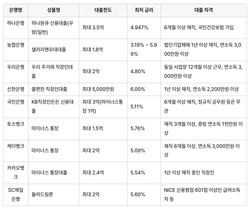 특징: 재직 6개월 이상 요건이 짧고, 신용이 좋은 경우 6개월 미만도 가능.
