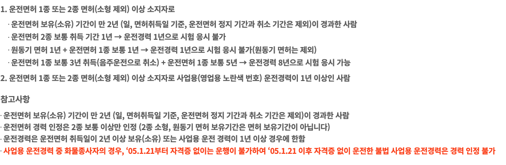 - 운전면허 1종 또는 2종 면허(소형 제외) 이상 소지자