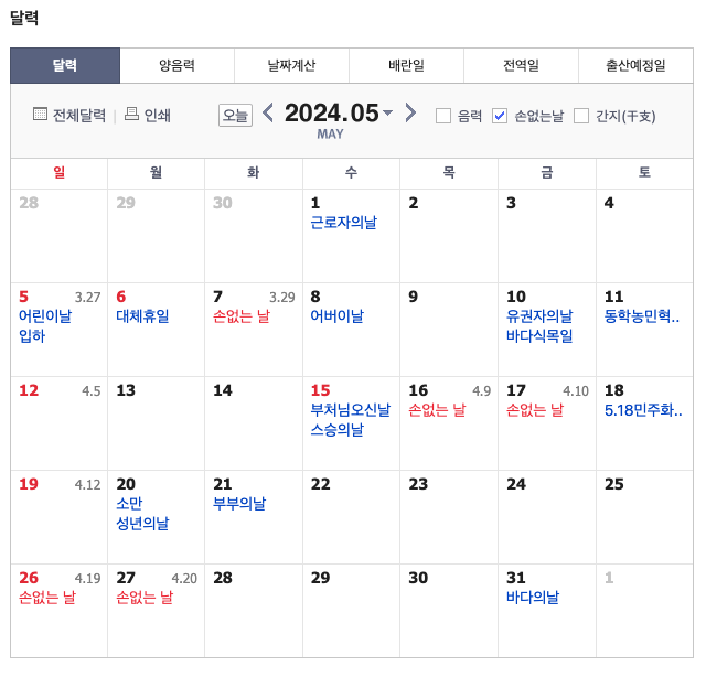 이사는 새로운 터전에서 삶이 시작되는 의미라 이사 날짜가 중요할 수 밖에 없는데요, 종종 예상치 못한 사고와 손실이 발생할 수 있기에 이를 방지하기 위해 "손 없는 날"을 선택하고 중요하게 생각하는 사람들이 많습니다. 이번에는 2024년 5월 이사계획이 있는 분들께 도움 되시길 바라며 손 없는 날에 알아보겠습니다.