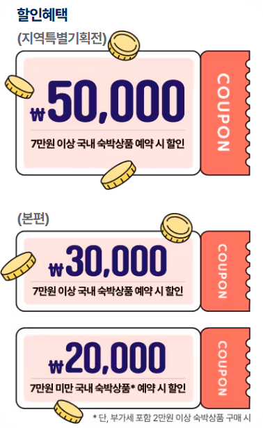국내 숙박상품 구매 할 때 최대 7만 원 초과 시엔 50,000원 할인 쿠폰 제공받을 수 있고,