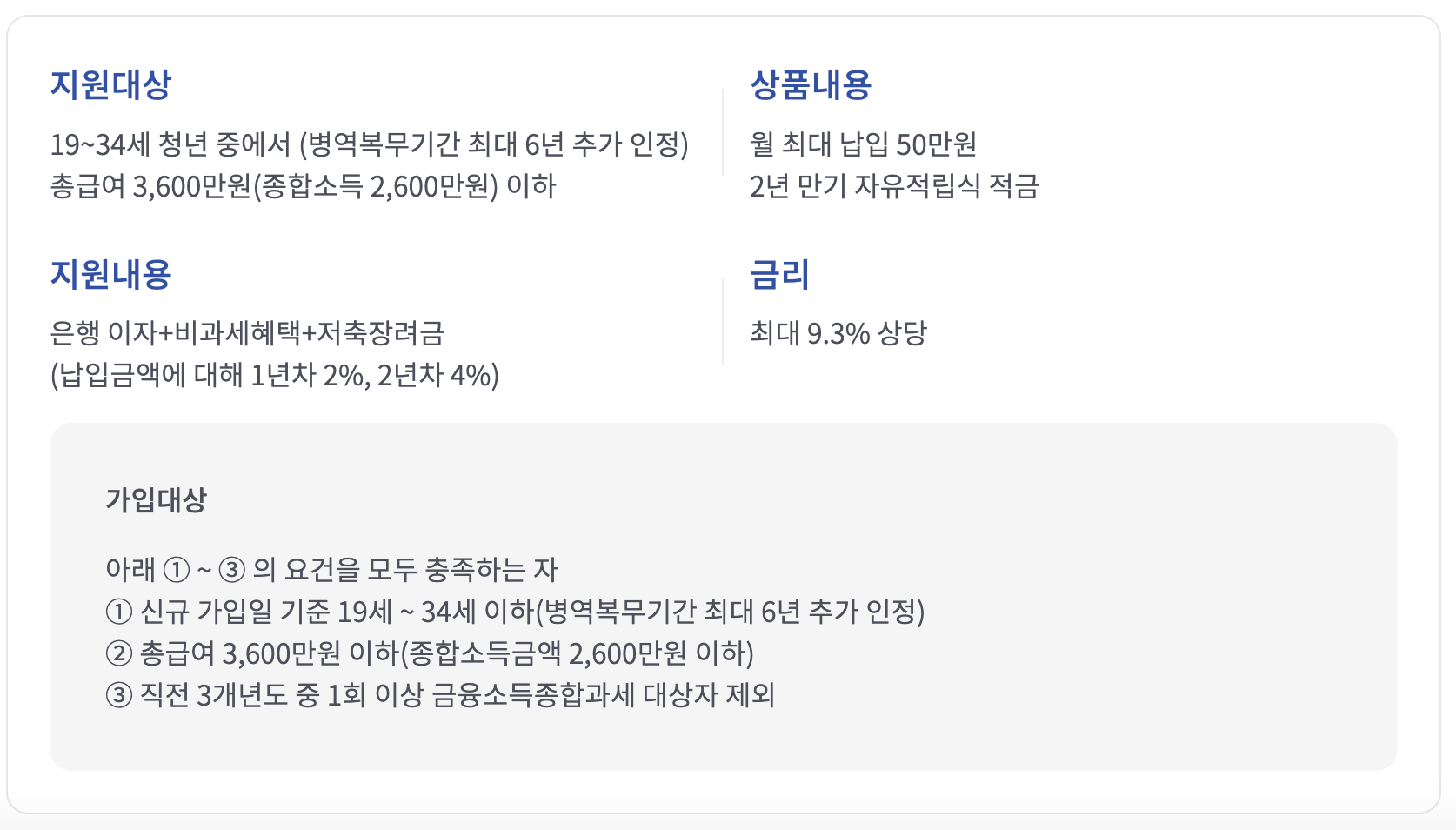 가입대상은 만 19세 이상 34세 이하인 청년 중 직전연도 종합소득금액이 연 2천600만원 이하인 사람이라면 누구나 참여가능합니다. 단, 군복무자의 경우 복무기간만큼 연령 연장이 인정되어 최고 39세까지 적용됩니다. 또한 취업성공패키지 유형 참여자 또는 내일채움공제 등 유사사업 참여자라면 우대금리를 제공받을 수 있으니 참고하세요!