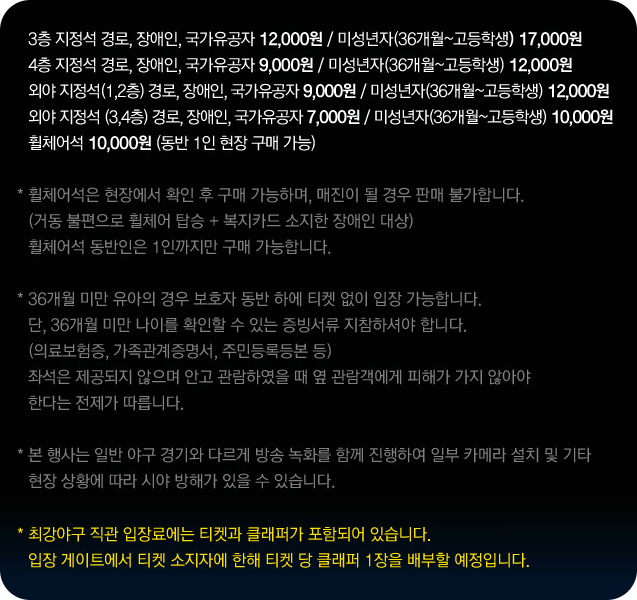 - 경로, 장애인, 국가유공자 및 미성년자(36개월~고등학생) 대상으로 3층 지정석과 4층 지정석, 외야 지정석에 대해 할인 혜택이 제공됩니다.