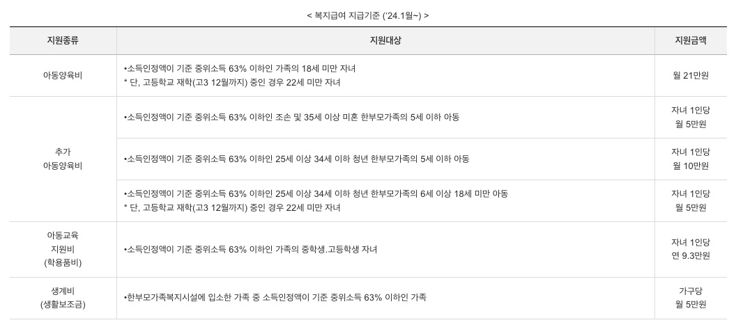 2024 한부모 가족의 아동양육비 지원, 아동교육지원비, 생활 보조금등 저소득 한부모 가정에 도움이 되고 자녀의 행복하고 건강한 성장과 안정적인 생활에 도움이 되는 정부지원금입니다. 아래 자격조건 확인해 보시고 지원대상에 부합한다면 신청하시고 혜택을 받으시길 바랍니다.