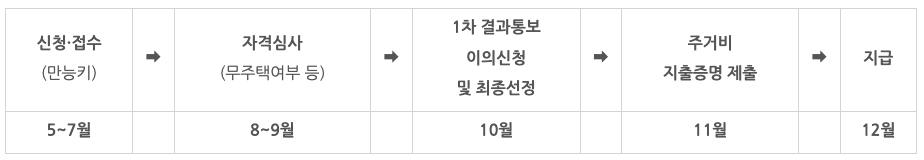 1️⃣ 신청 접수 (5~7월) →2️⃣ 자격 심사 (8~9월) →3️⃣ 1차 결과 통보 (10월) →4️⃣ 이의신청 및 최종 선정 (11월) →5️⃣ 주거비 지출 증빙 제출 후 지급 (12월부터 지급 시작)