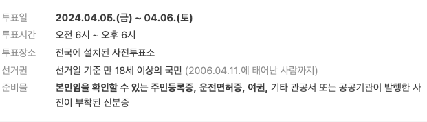 더 많은 사람들이 투표에 참여하여 우리의 목소리를 듣게 하는 중요한 과정에 참여해 보시길 바랍니다. 우리의 선택이 국가의 미래를 결정짓는 데 큰 영향을 끼칠 것입니다. 사전투표든 본 투표든 잊지말고 꼭 나의 권리를 행사해보세요.