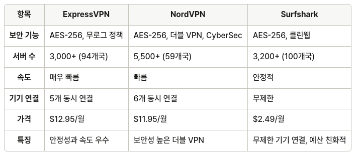 위 3사의 VPN 서비스는 특정 사용자층에 맞는 장점을 잘 따져 보시고 선택 하셨으면 좋겠습니다. ExpressVPN은 최고의 속도와 안정성을 찾는 사용자에게 적합하며, NordVPN은 보안과 가격 대비 성능이 뛰어나 가성비를 중시하는 사람들에게 추천할 만합니다. Surfshark는 예산이 한정된 사용자나 다수 기기를 사용하는 가족에게 적합하며, 무제한 연결 기능으로 큰 이점으로 판단되실 겁니다.